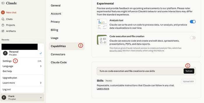 进入设置(Settings)→ 能力(Capabilities)→ 开启技能(Skills)。