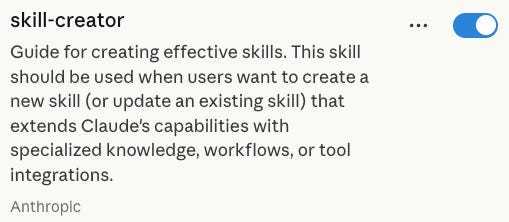 前往“示例技能”(example skills)浏览 Anthropic 创建的技能。开启你想要的任何技能。只需确保“技能创建器”(skill-creator)始终处于开启状态(这是让你构建自己技能的关键)。