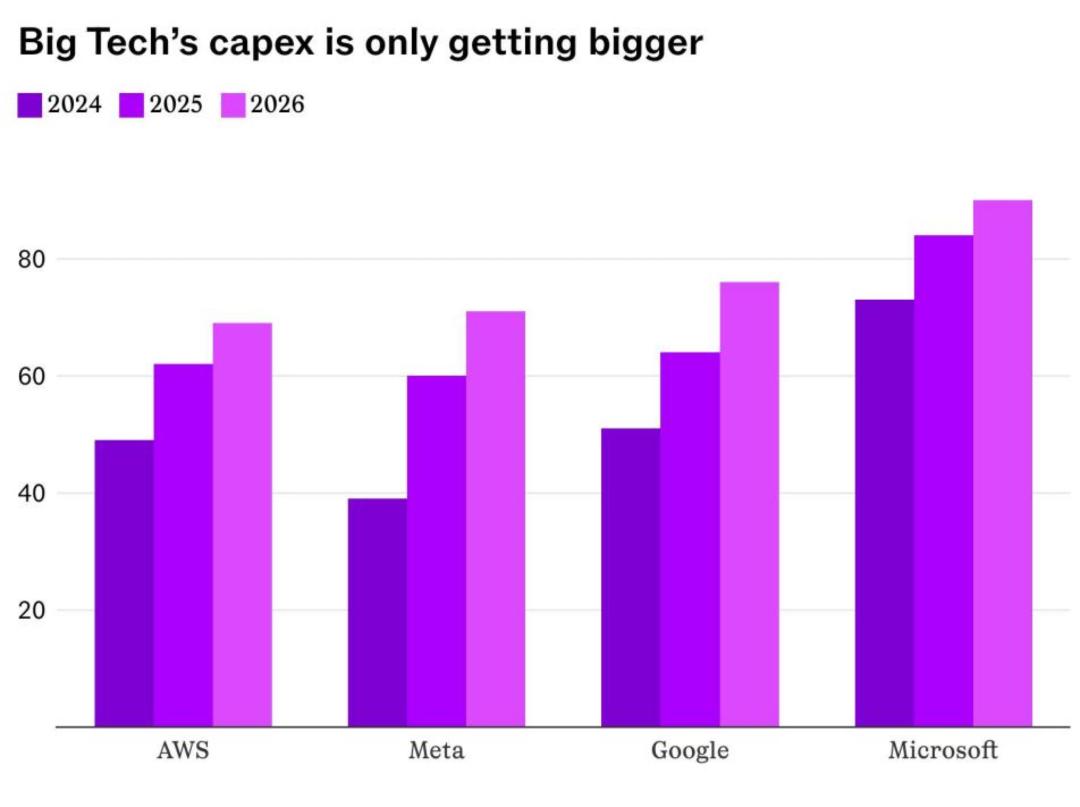 今天,类似的“先修路、先占位”逻辑,正在 AI 身上以更大的量级重演。到2026 年,四大科技巨头预计将投入 6500 亿美元用于 AI 基建,比 2025 年高出接近 60%;微软 FY2026 Q2 单季资本开支就达到 375 亿美元,其中约三分之二直接投向了 GPU 和 CPU。