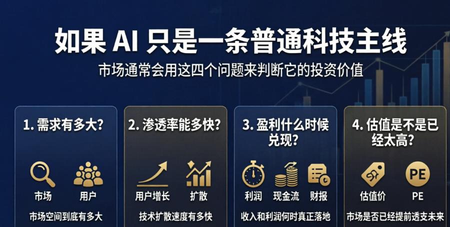 如果 AI 只是一条普通科技主线,那分析方法其实并不复杂。无非就是看需求有多大、渗透率能爬多快、盈利什么时候兑现、估值是不是已经太高。这套逻辑,市场过去分析互联网、云计算、新能源的时候,早就用得很熟了。