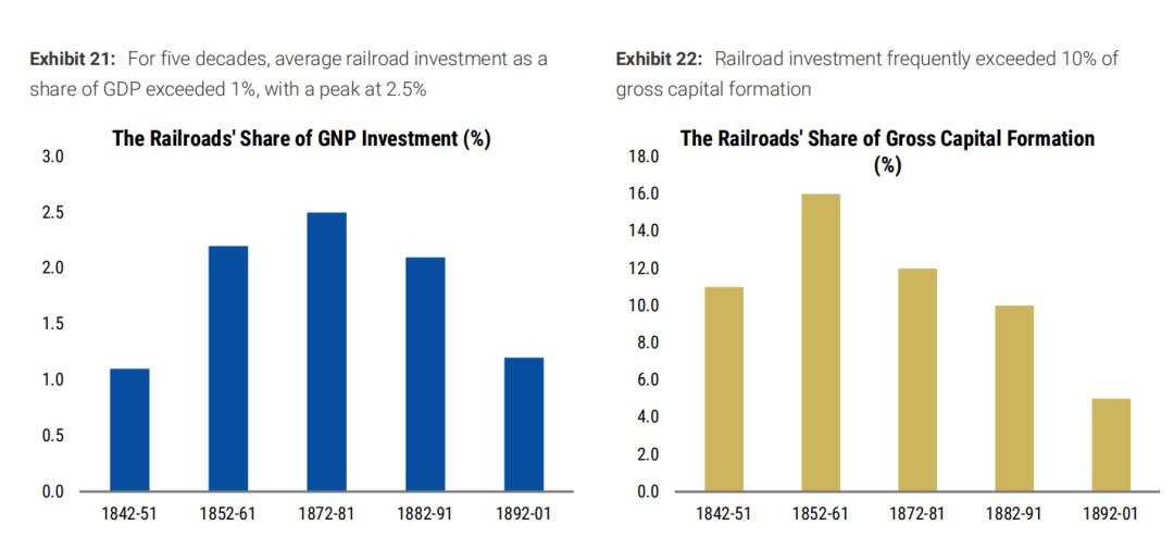 19 世纪修铁路时,投资一度占到美国 GDP 的 2.5%,还占到全国总资本形成的 10% 以上。这已经不是普通的产业扩张,而是一场全国性的“修路狂潮”。
