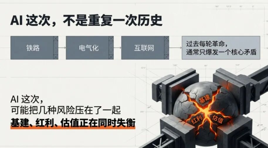 所以,AI 这次真正让人不安的地方,不只是它更热,而是它把过去几轮技术革命里最危险的几面,几乎同时摆到了我们面前:基建先热,红利后到,市场先炒,而且风险还更早外溢。