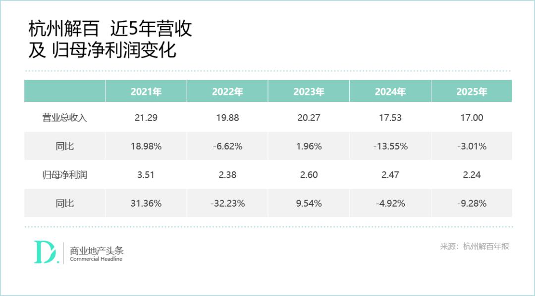 财报显示,2025年杭州解百实现营业收入17亿元,同比下降3.01%;归母净利润2.24亿元,同比下滑9.28%,核心盈利指标全面承压,而作为营收主力的杭州大厦,其表现直接关联集团业绩走向。