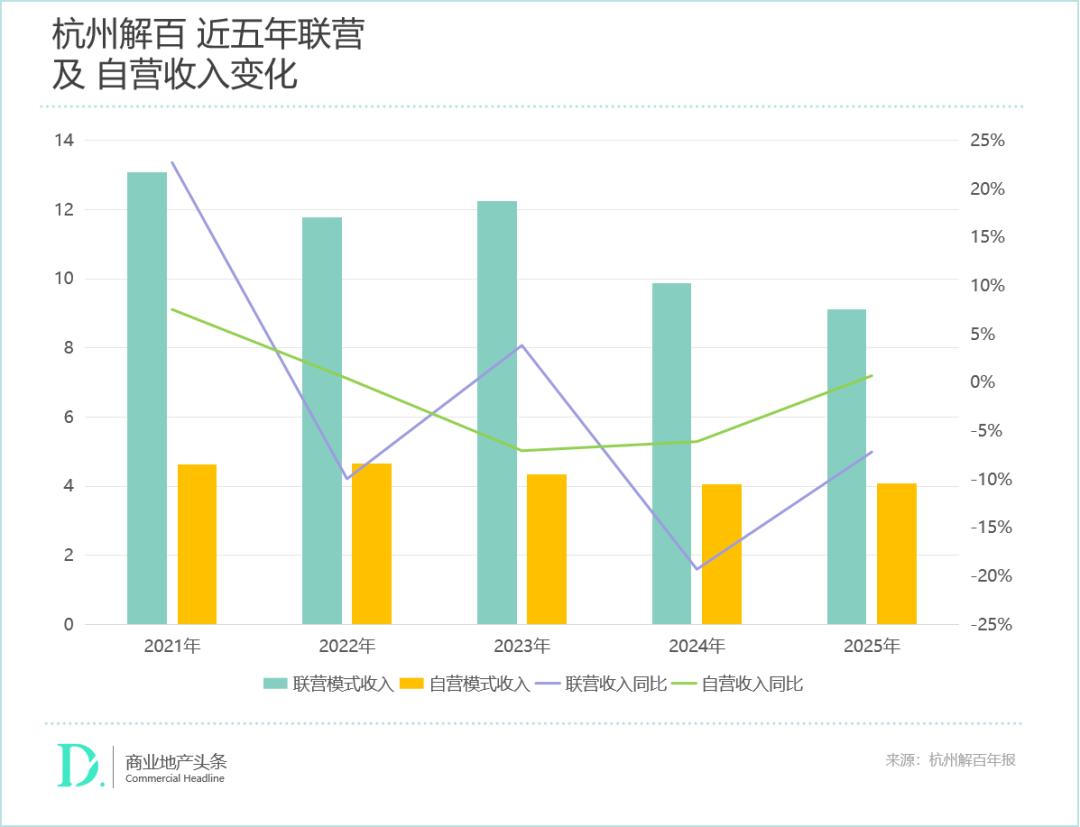 2025年,杭州解百零售业务收入13.27亿元,同比下降5.20%。其中,联营模式收入9.17亿元,同比下滑7.17%,拉低了公司整体盈利水平;自营模式收入4.10亿元,同比2024年略有提升。