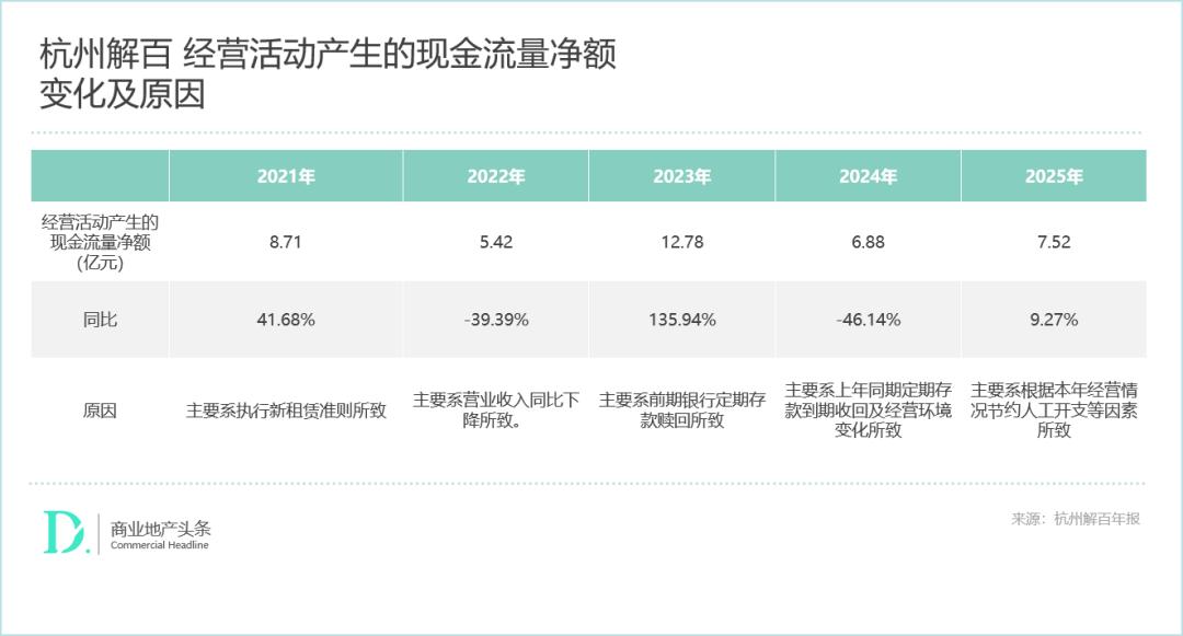 但值一提的是,在一系列积极调整下,解百的营收降幅缩窄了,且经营活动产生的现金流量净额更是重回增长。数据显示,杭州解百2025年的经营性现金流净额却同比增长9.27%至7.52亿元。公司在盈利承压的情况下,加强成本端控制改善现金流的,包括节省人工开支等措施。