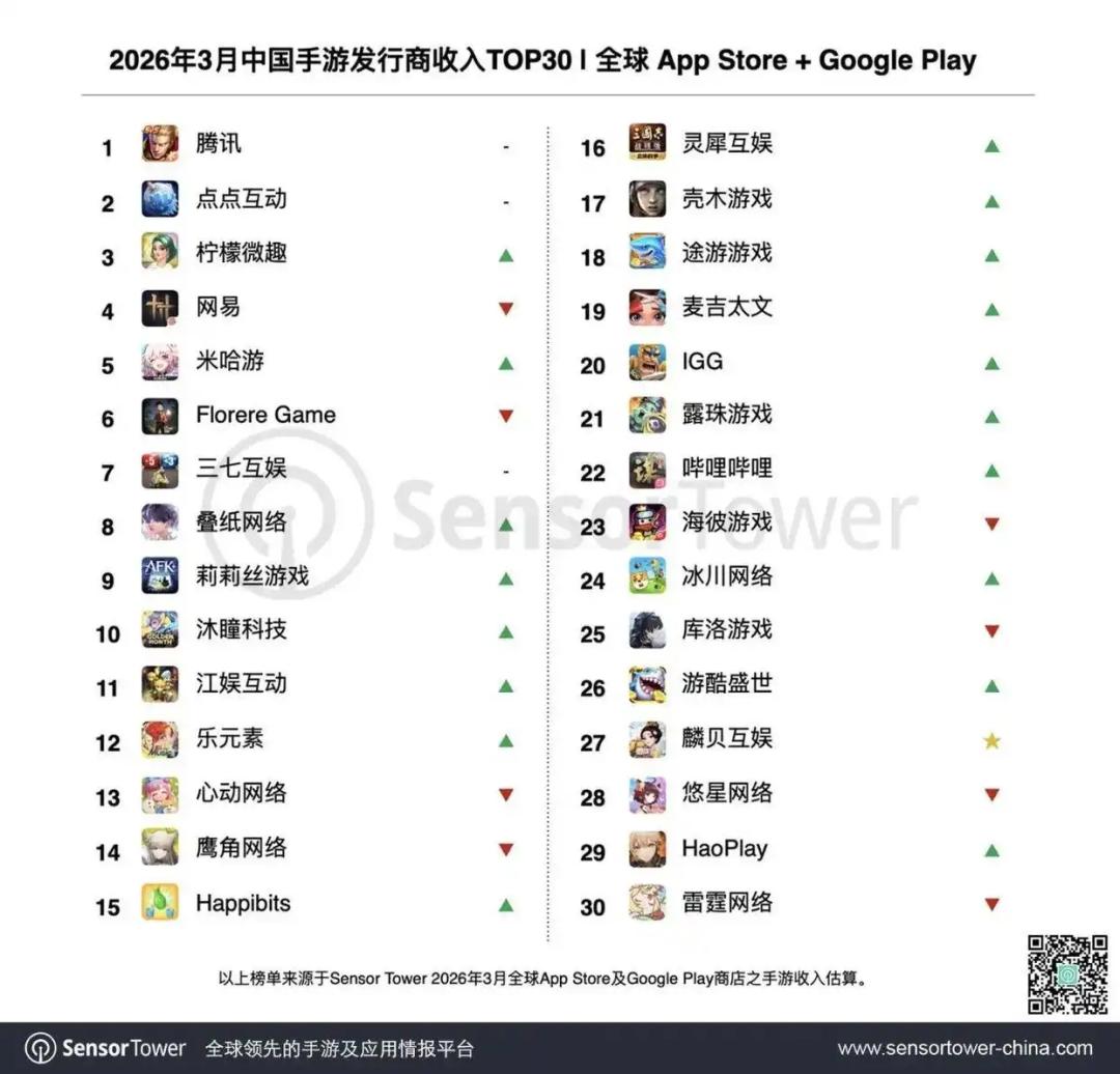 3月,三七互娱收入环比上涨28%,位列全球第7。最大功臣《Last Asylum: Plague》,凭借新颖题材和副玩法,本期收入暴涨近11倍,成为2026年全球化现象级力作。