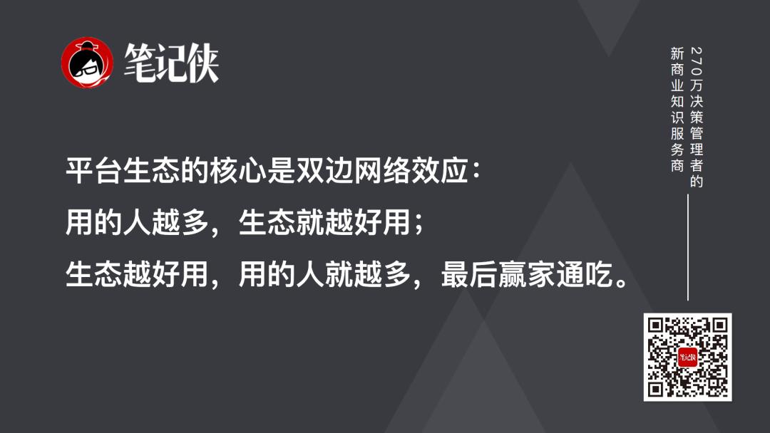 平台生态的核心是双边网络效应——用的人越多,生态就越好用;生态越好用,用的人就越多,最后赢家通吃。