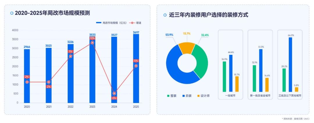 一是以旧换新,激活存量市场,一站式焕新服务成刚需。随着国家“两新”政策加力扩围,局部改造、旧房翻新及家居换新需求集中爆发。行业预估在2025年度的3697亿元的局改市场规模上,叠加消费者自装偏好,催生了拆旧、清运、返货、换货等一站式“焕新”服务需求。