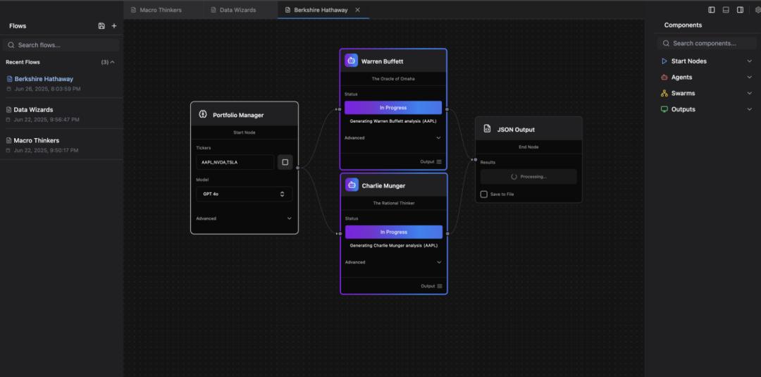 最后,访问http://localhost:3000,即可进入可视化Agent流程编辑器,拖拽搭建你的专属AI投资委员会。