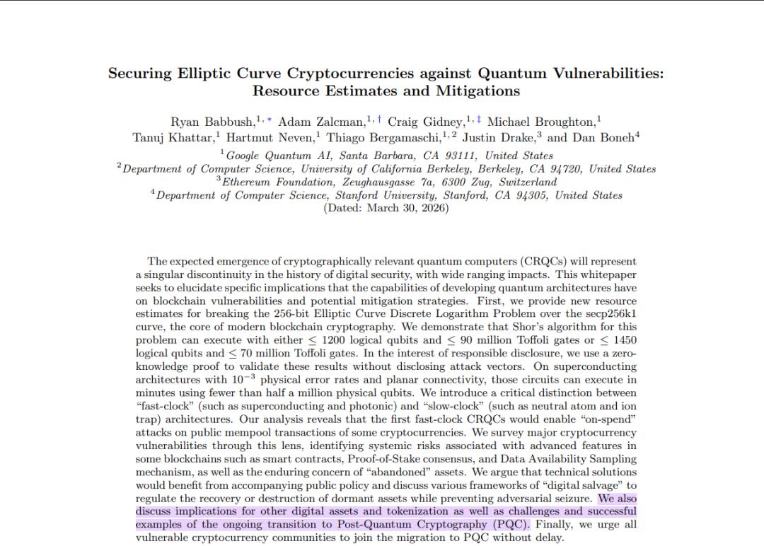 谷歌量子人工智能团队于2026年3月30日发布的题为《保护椭圆曲线加密货币免受量子漏洞影响:资源估算与缓解措施》的报告指出,一台50万比特的量子计算机就可以破解比特币所依赖的椭圆曲线加密算法(ECC),所需的计算资源仅为此前预计的二十分之一。