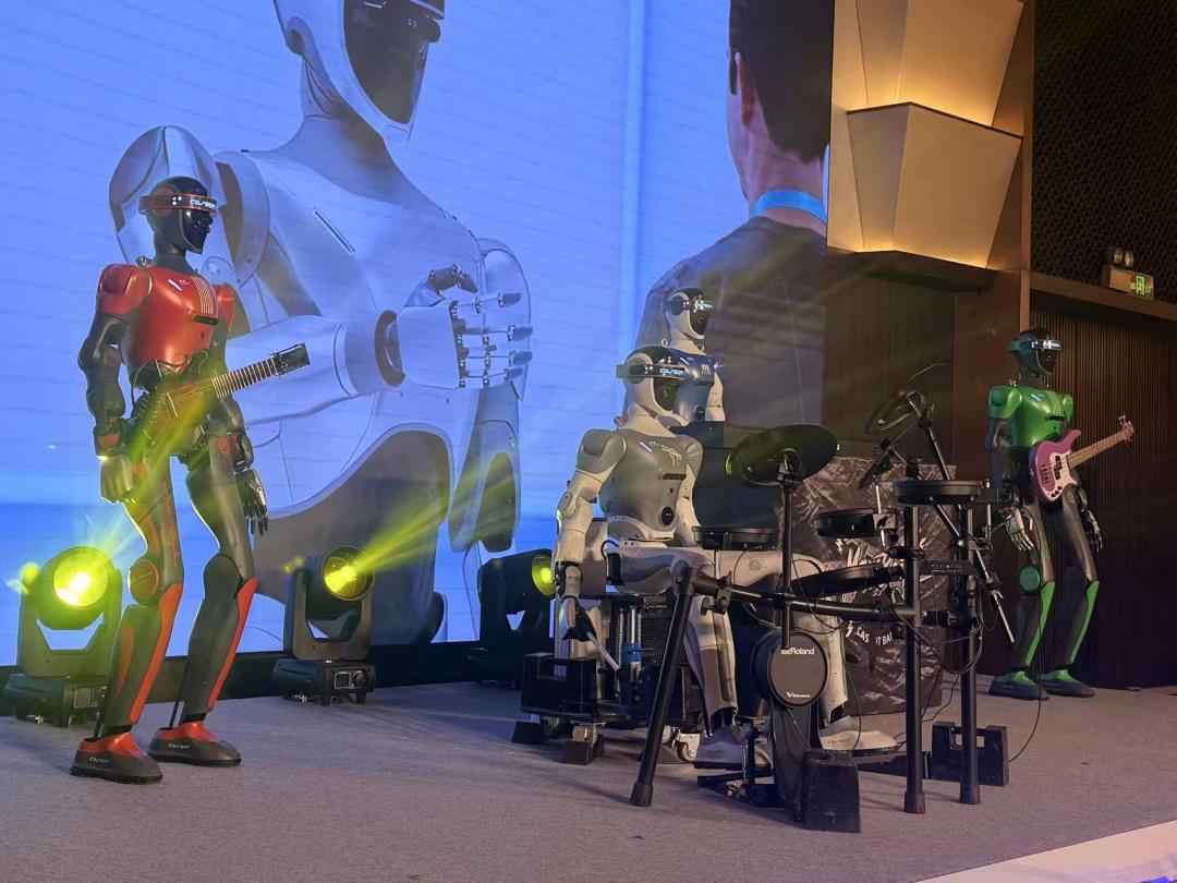一支机器人乐队格外惹眼。电子琴、贝斯、吉他、架子鼓,四五台不同品牌的机器人各司其职,已被调试得有模有样。