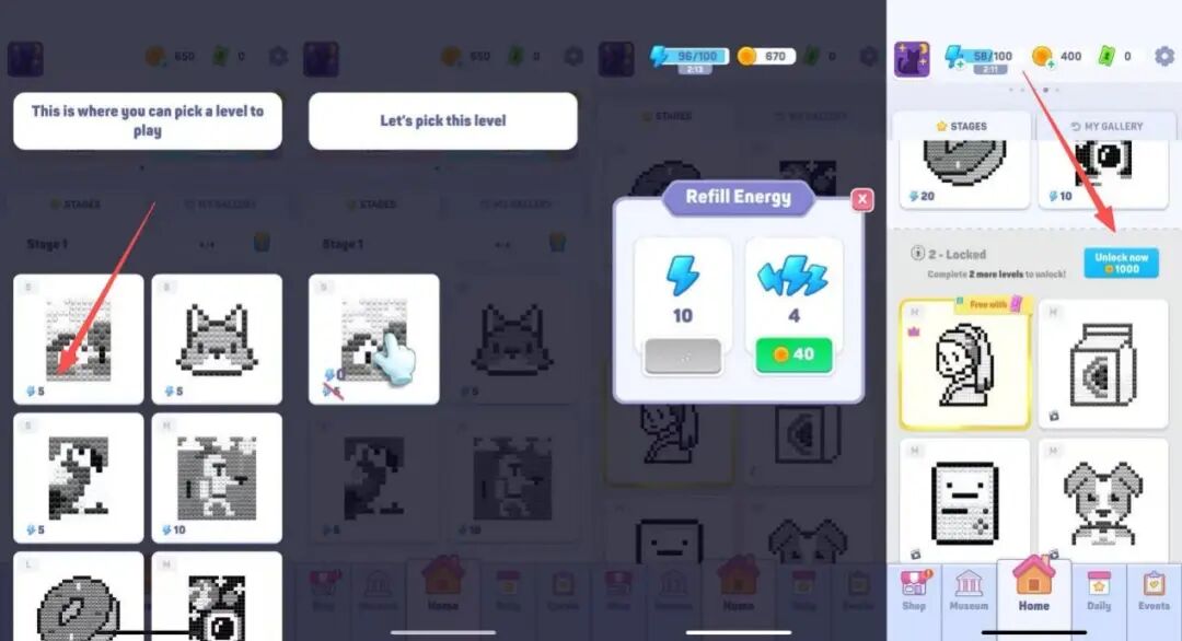 尝试玩教学关后,玩家就要开始探索主线。游戏的主线关卡被做成了至少 6 个一组的分组,玩家必须要全部通关才能解锁下一组,否则就要花硬币购买。