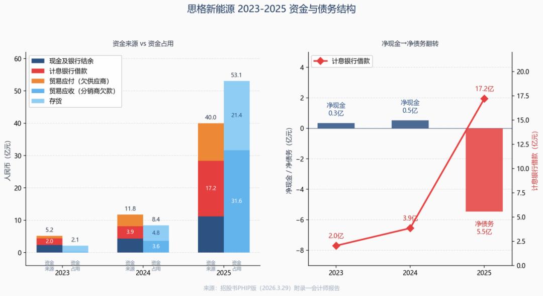 经营造血能力相对有限,银行借款出了大力。2025年底账上现金11.2亿,但计息银行借款从3.9亿膨胀到17.2亿,其中绝大部分是短期借款,公司已从净现金翻转为净负债5.5亿。加上欠供应商的11.6亿贸易应付,整个思格的运营资金链中,应收撑着资产,借款撑着现金。