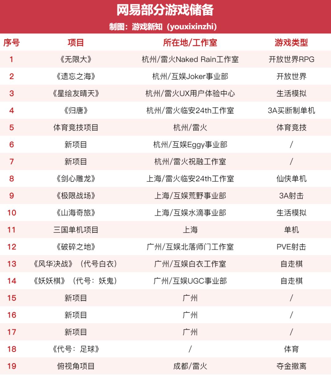 据公开信息和访谈了解,游戏新知整理出网易部分游戏储备,包括杭州《无限大》《遗忘之海》《星绘友晴天》《归唐》、上海《剑心雕龙》《极限战场》《山海奇旅》、广州《破碎之地》《妖妖棋》等项目。