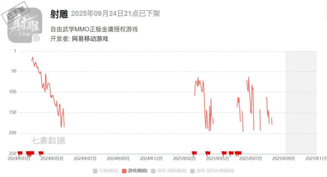 可惜到底无力回天,最终《射雕》运营了一年多就停运了,仅在上线之初短暂进入过iOS畅销榜TOP50。