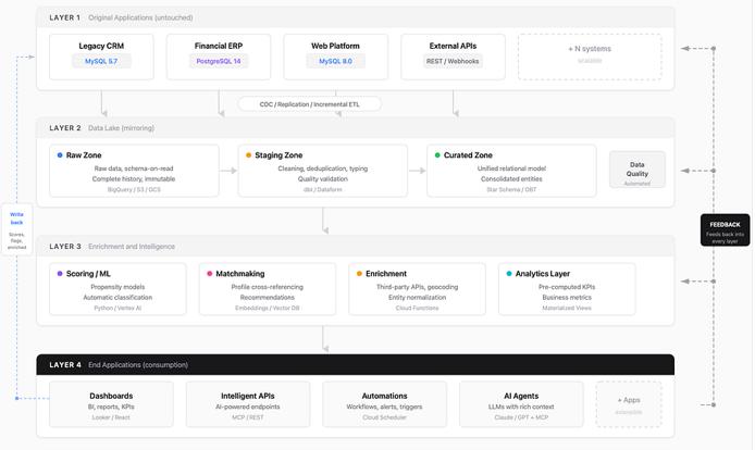 这一层的一个基本特点是它能够反馈到之前的所有层。机器学习模型计算出的分数可以写回源数据库,因此传统应用程序也能受益于生成的智能信息。自动化流程产生的新数据会流入数据湖。人工智能代理的结果会触发增强层中的指标重新计算。整个系统形成一个循环:每一层都受益于其他层的贡献。