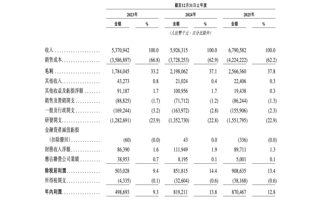 2023-2025年,晶晨股份的收入分别约53.71亿、59.26亿、67.91亿元;毛利分别约17.84亿、21.98亿、25.66亿元,毛利率分别为33.2%、37.1%、37.8%;净利润分别约4.99亿、8.19亿、8.70亿元。
