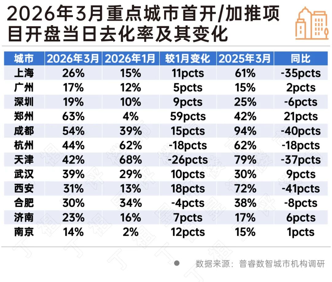 普睿数智城市机构调研数据显示,3月份12个重点城市开盘或加推房源整体去化率为34%,相较1月份增加9个百分点。