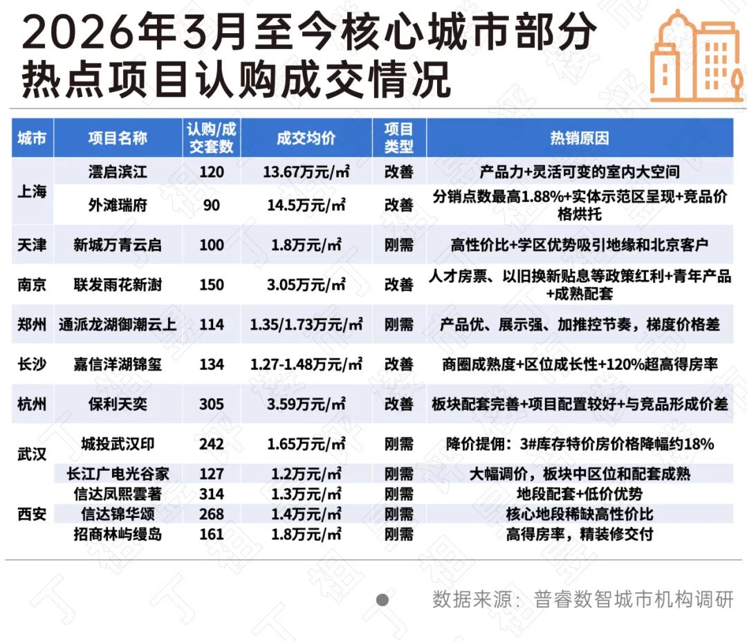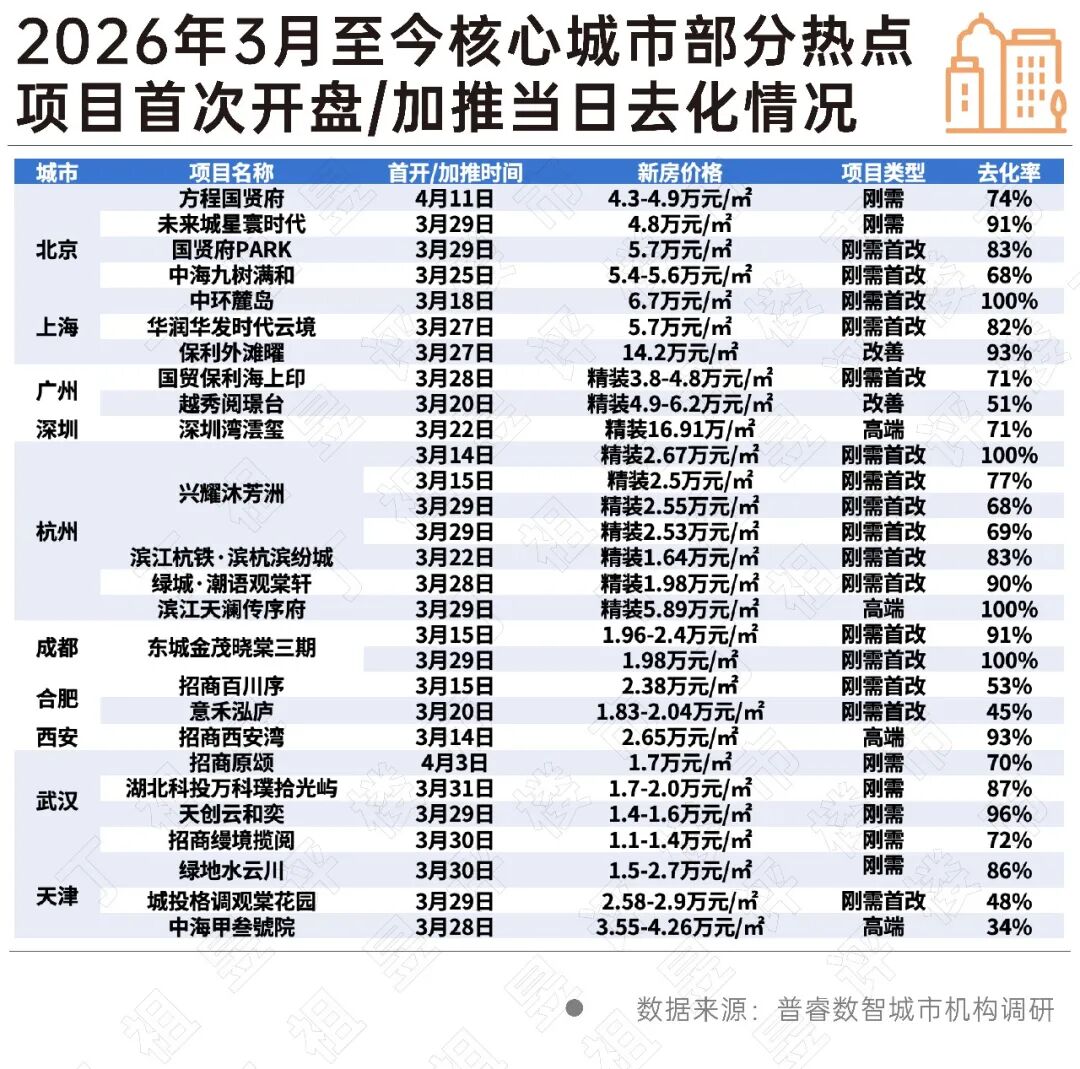 从3月份重点城市首开/加推热销项目整体来看,与往日改善和高端项目为主要热销项目不同,2026年3月至今刚需刚改项目开始成交领跑。