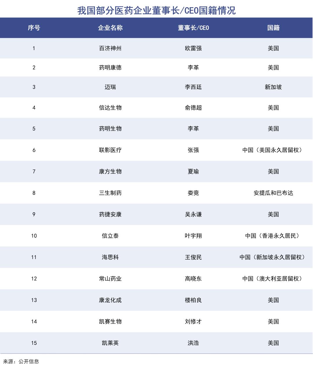 康方生物创始人、董事长兼CEO夏瑜,药捷安康创始人、董事长兼CEO吴永谦,康龙化成董事长兼CEO楼柏良,凯莱英医药集团创始人、董事长兼CEO洪浩,凯赛生物的创始人、董事长刘修才均为美国国籍。