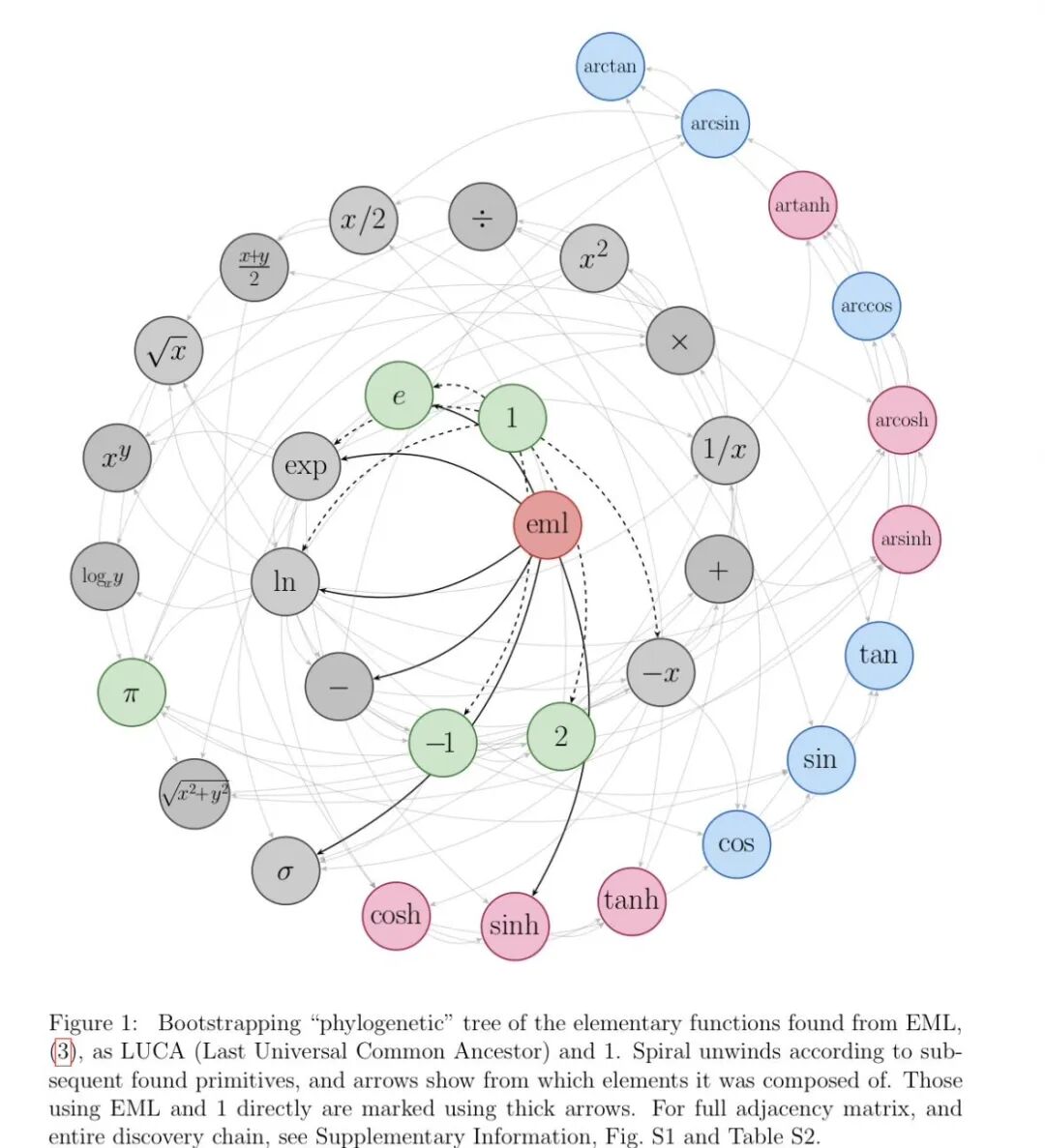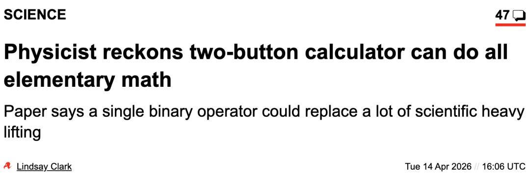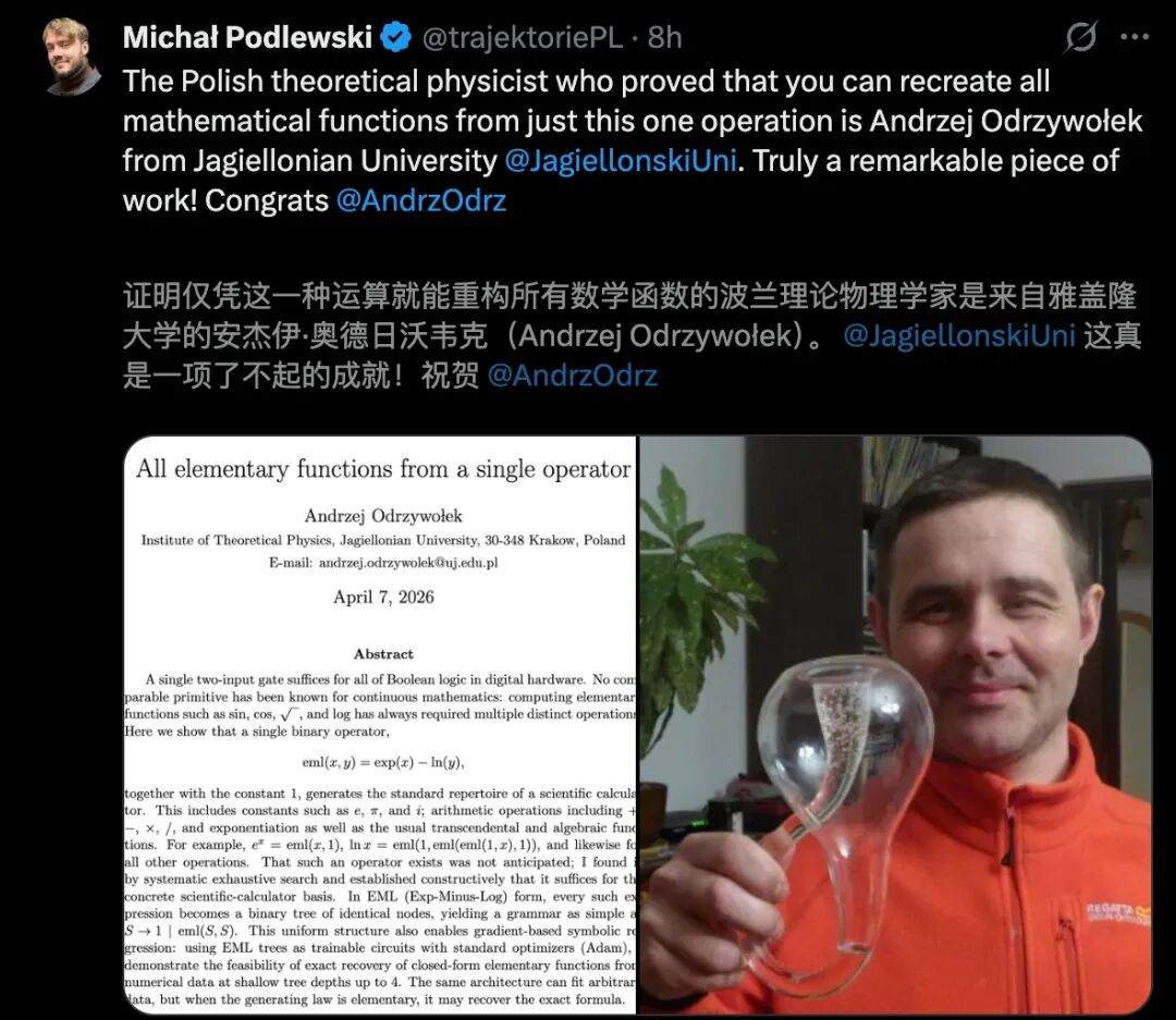 2026年4月,波兰雅盖隆大学的物理学家安杰伊·奥德尔齐沃莱克(Andrzej Odrzywołek)在扔出了一篇论文,标题翻译过来就是:「用单个二元算子生成所有初等函数」。
