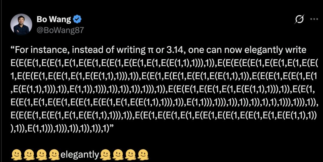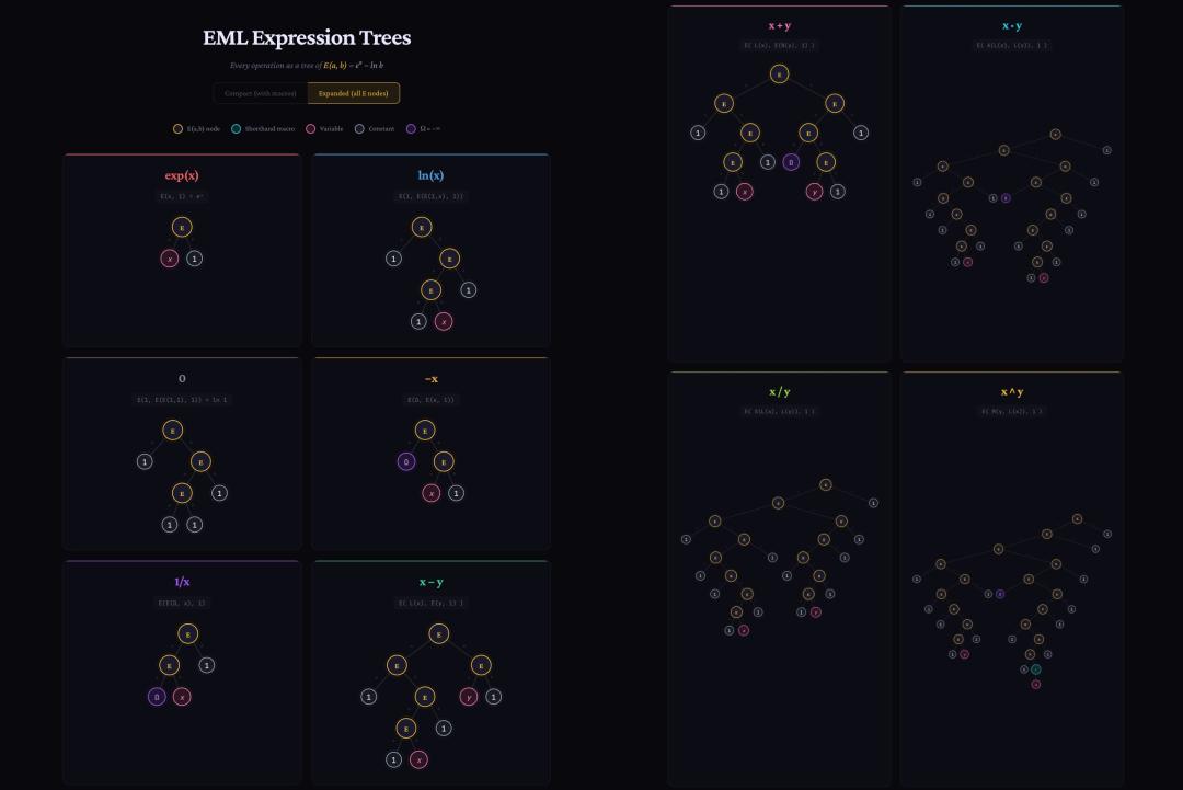 但现在我们知道了,它们全部是同一个「超级祖先」的后代,都是eml(x,y)=eˣ−ln(y)这一行代码通过不同方式自我折叠后的产物。