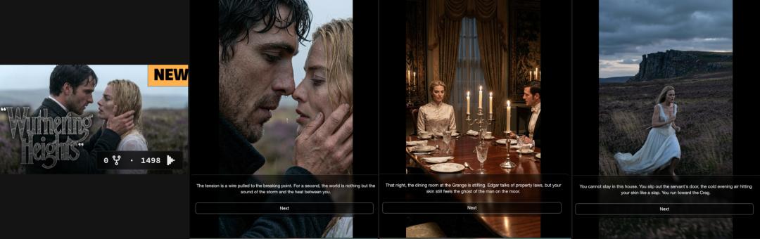 图|《呼啸山庄》互动影游:经典文学IP + AI视频生成,封面(左)与游戏内叙事场景(右)。公共版权免授权,原作文本直接喂给AI即可产出高品质内容。来源:Rosebud平台