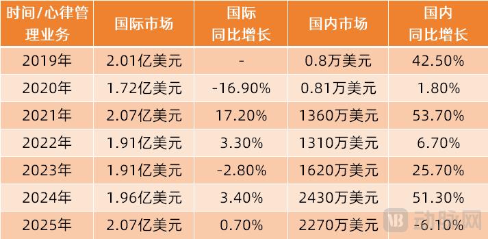 (微创医疗心律管理业务2019-2025年国内国际营收情况)