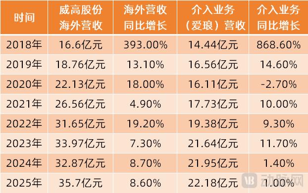 作为全球化布局的重要举措,威高股份收购美国爱琅取得了可喜的成果。自爱琅2018年并入威高集团的介入业务以来,其介入业务与海外营收均保持了较好的增长态势,尽管期间还遭遇了集采、疫情等多重影响业绩的因素。其介入业务营收从2018年的14.44亿元增长至2025年的22.18亿元。威高股份的海外营收也从2018年的16.6亿元增长在2025亿元的35.7亿元。