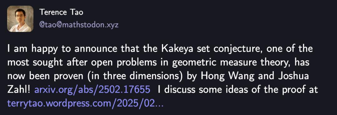 菲尔兹奖得主陶哲轩曾激动发文,称这是「几何测度论中最受瞩目的突破」。