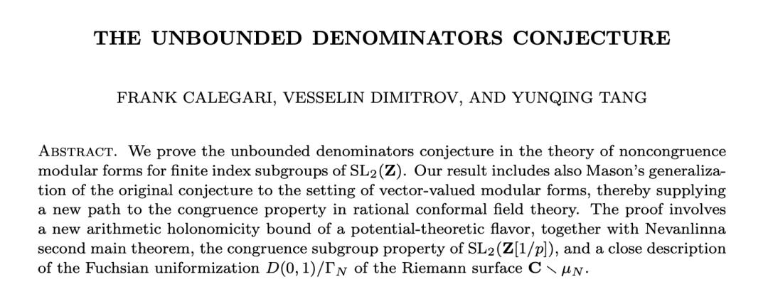 第一件,证明了关于模形式的「无界分母猜想」(unbounded denominators conjecture)。模形式是数学中一类极其基础和重要的对象,这个猜想困扰了数论学家几十年。
