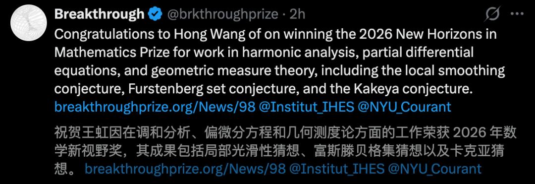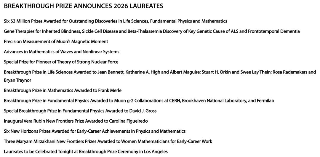 今天,素有「数学界奥斯卡」美誉的2026年突破奖出炉了!