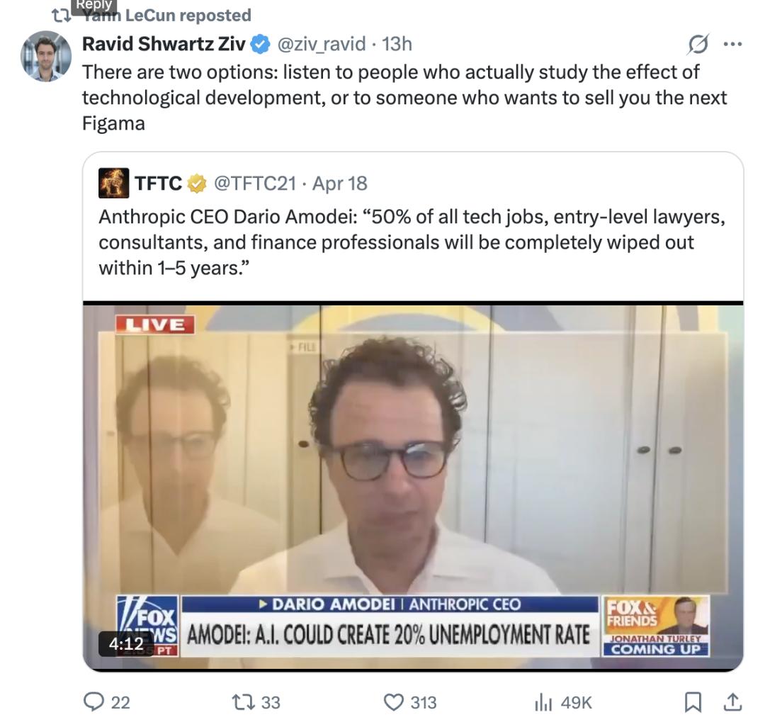 LeCun转发了一条 X,是Fox & Friends 播出的一段 Dario关于 AI 失业的发言片段说:AI 会在 1-5 年内消灭 50% 的科技岗位、初级律师、咨询顾问和金融从业者。失业率,可能推到 20%。Fox News 把这段剪出来,标题黑底白字:“CEO WARNS A.I. COULD WIPE OUT WHITE-COLLAR JOBS”。