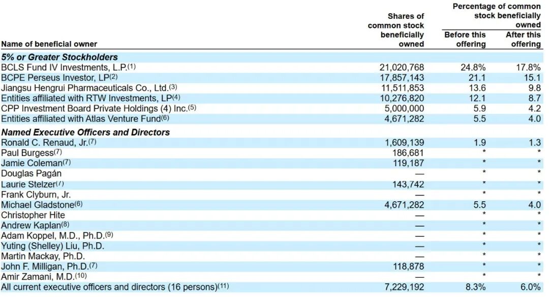 IPO后,BCLS Fund IV Investments持股为17.8%,BCPE Perseus Investor持股为15.1%,Jiangsu Hengrui Pharmaceuticals持股为9.8%,RTW Investments持股为8.7%,CPP Investment Board Private Holdings持股为4.2%,Atlas Venture Fund持股为4%。