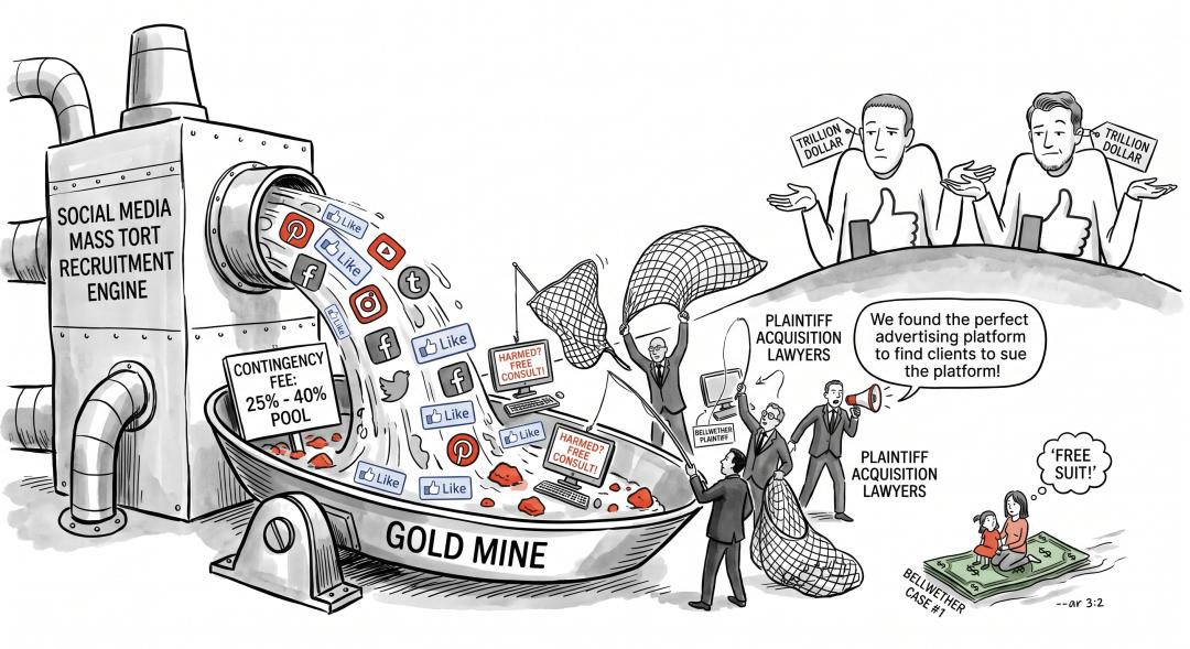 电视上有广告,社交媒体上也有广告——律所用社交媒体的广告系统来招募起诉社交媒体公司的原告,这个讽刺没有让任何人减速。有些律所甚至不做实质性的法律工作——它们的商业模式是纯粹的案件获取:签下尽可能多的原告,然后把案件转给有能力打仗的大律所,自己保留一笔介绍费或未来赔偿的分成。