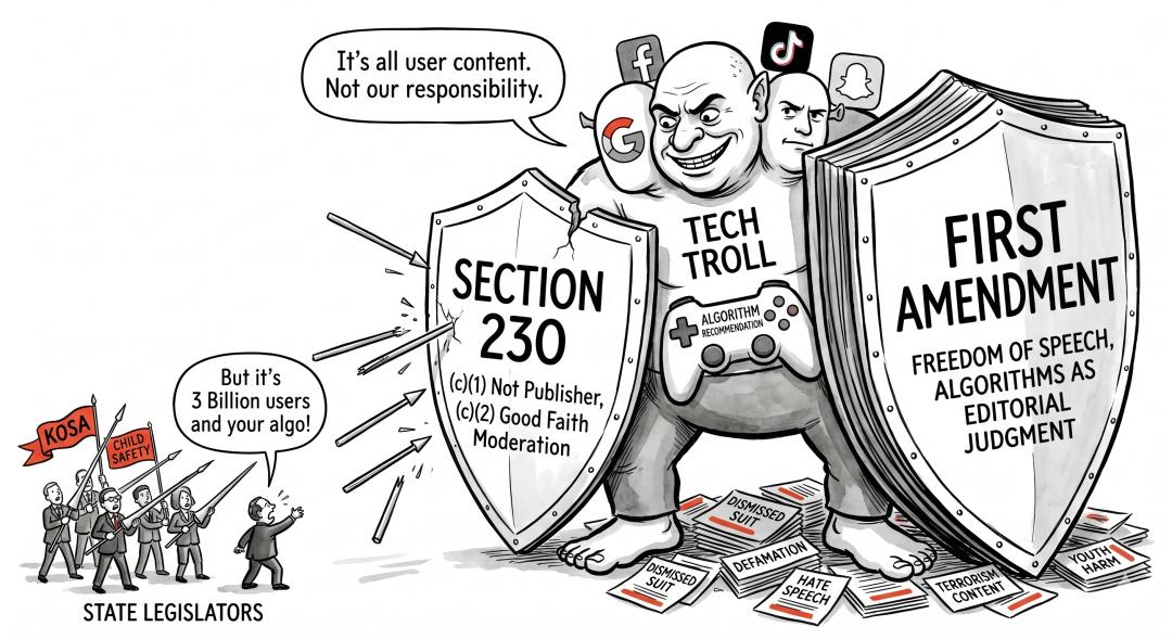 但光有弹药还不够。律师手里有了证明公司"明知故犯"的文件,可他们仍然过不了 Section 230 这一关。只要法院把社交媒体归类为"出版者",230 就会挡掉所有诉讼。上一段讲的 Gonzalez 案已经说明了这一点——最高法院都不愿意碰这个问题。