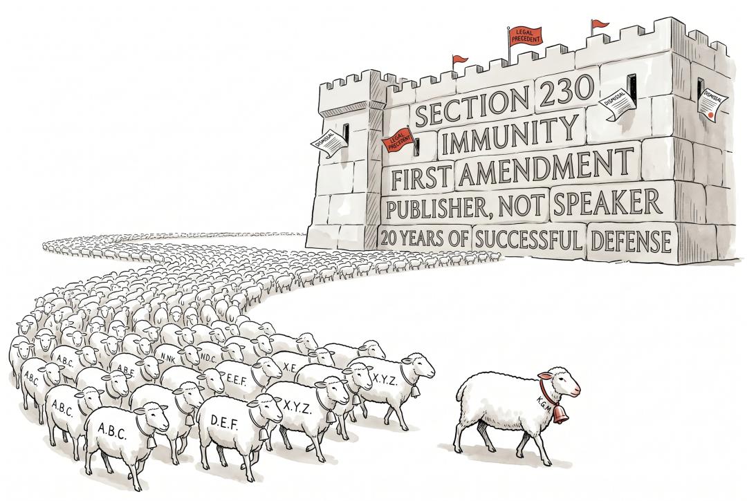 从 1997 年到 2020 年代初,Section 230 挡掉了数百起诉讼。不管你告的是诽谤、仇恨言论、恐怖主义内容还是对青少年的伤害,平台的回答都是同一句话:那是用户发的内容,不是我们的责任。法院几乎每一次都接受了这个抗辩。