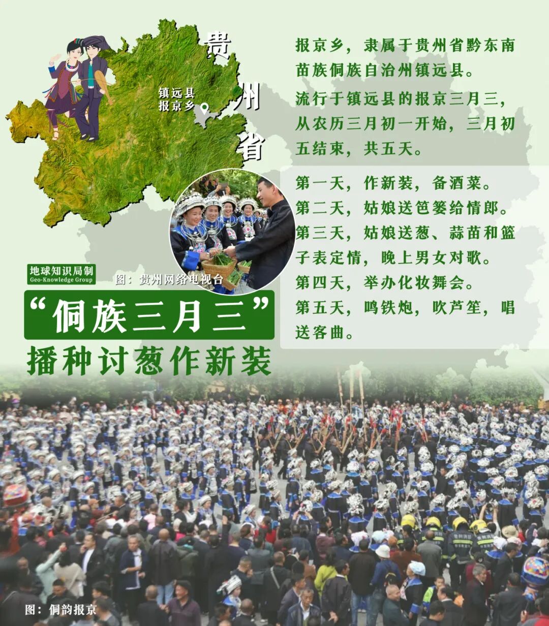 “侗族三月三”,各地节庆形式不一。贵州镇远的“报京三月三”,也称“播种节”,节期5天。青年男女常于此时以葱、蒜定情,此外还有跳芦笙舞、走亲串寨、集体欢宴、对歌等民俗活动。