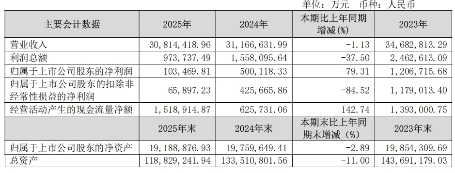 - 归母净利润大幅下滑79.31%,仅剩10.35亿元;