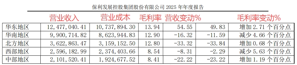 全国不同区域拉开巨大差距在保利的年报中也有体现。保利五大区域中,营收正增长的只有华东地区,北方地区下滑幅度最大,为33.84%。毛利率方面,华东、北方、中部三个区域同比上年增长,华南、西部区域分别减少4.66、5.63个百分点。