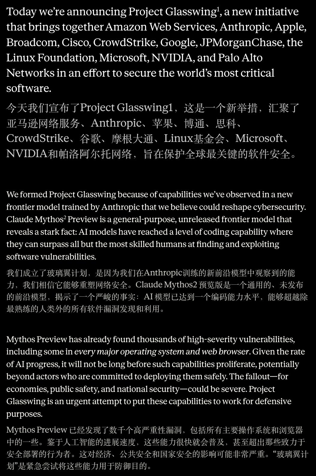 4 月 7 日,Anthropic 推出 Project Glasswing,直接把这项计划定义为「用前沿 AI 保护全球最关键的软件」。