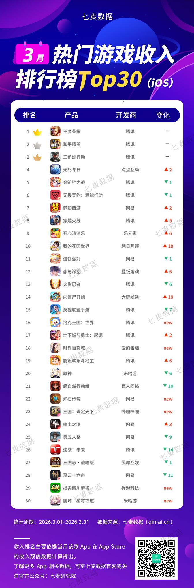 近日,七麦数据发布了2026年3月热门游戏排行榜,其中包括热门游戏下载榜Top30和热门游戏收入榜Top30。接下来让我们一起来看看吧!