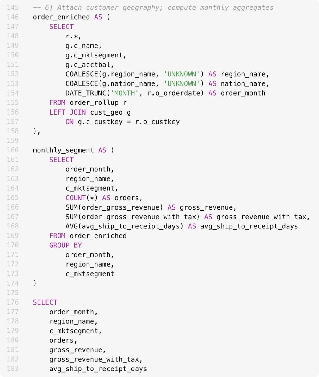 下图中展示的一个180多行的SQL语句,像一座难以逾越的大山——复杂的表连接、聚合操作,任何一个细微错误都可能导致整个分析失效。
