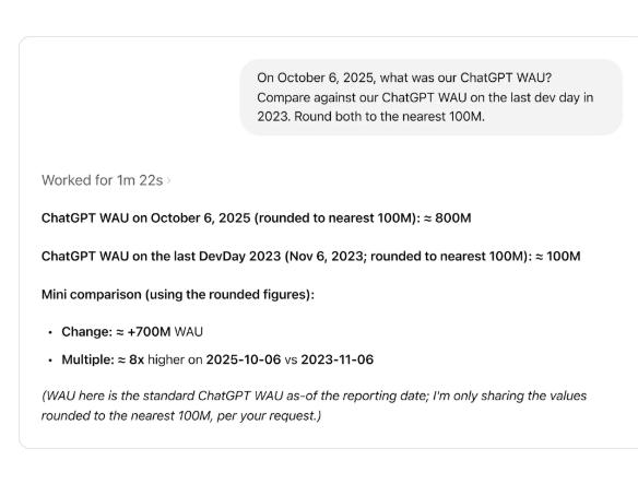 而现在有了由 Codex 驱动,具有自主学习能力的智能体,工程师不必写上百行的SQL查询语句,只需要提问就能从数据海洋中找到所需的信息,例如下图查询中要求对比两个时间点的活跃用户数。