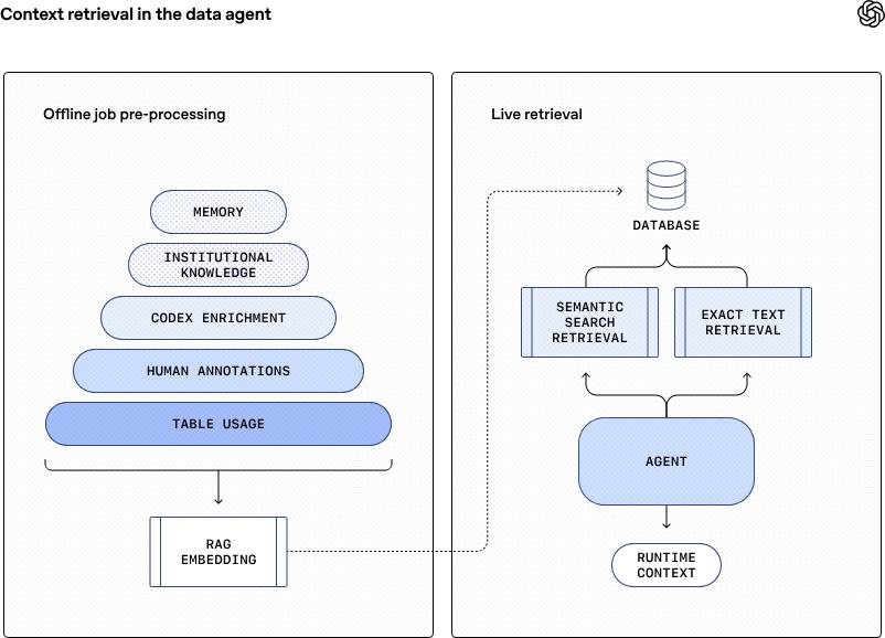 在内部,OpenAI做了一件更激进的事:让 Codex 驱动的数据智能体接管「找表—懂表—写SQL—校验结果」这条链路,用一套六层上下文架构,把数据语义补齐、把组织知识接入、把经验记忆沉淀,让工程师用提问取代搬砖。