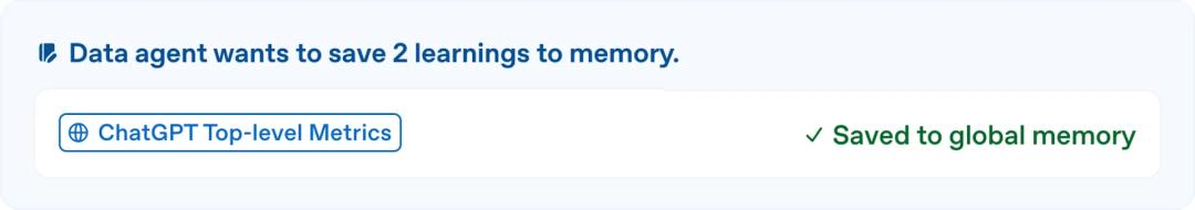 而最关键的第五层学习进化,让智能体拥有持久的记忆。当它从用户那里获得纠正,或发现数据问题的细微差别时,能够保存这些经验供下次使用。记忆也可以由用户手动创建和编辑。可以全局适用,也可以是只独属于某个使用者。