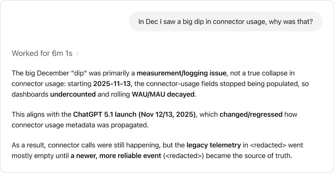 例如,当用户询问「12月连接器使用量为何大幅下降」时,智能体没有简单地报告数字下降,而是通过机构知识发现这主要是测量/日志记录问题,而非真正的使用量崩溃,与ChatGPT 5.1发布导致的数据收集变化相关。