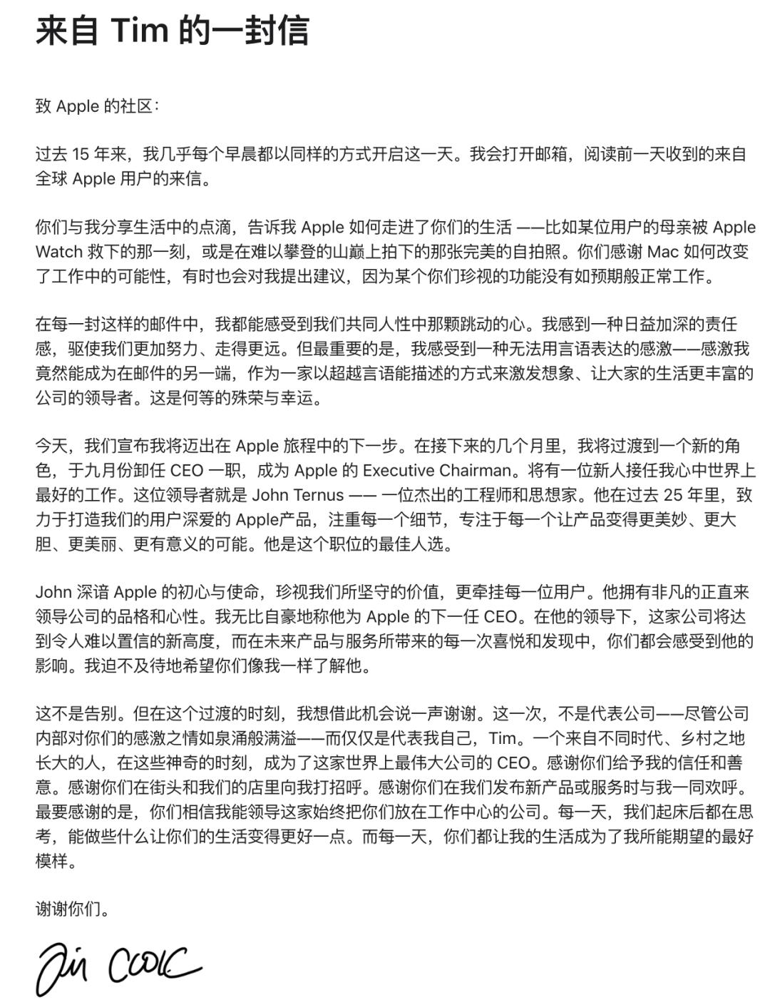 库克在信中表示,自己将在今年内卸任 CEO 并转任董事长。他与特努斯深谈多次,发现他具有远见和卓越人格。「约翰是帮助我们迈向未来、开拓大胆新方向的合适领导者。」