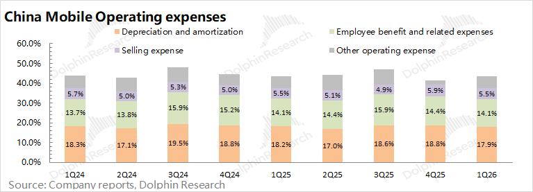 中国移动2026年第一季度经营费用1162亿元,同比增长1.5%。海豚君将“销售费用”、“雇员薪酬费用”、“折旧及摊销”和“其他营运支出”四项都放在经营费用中;