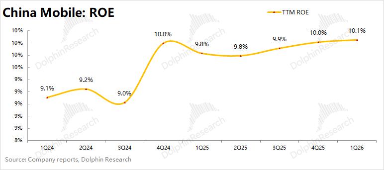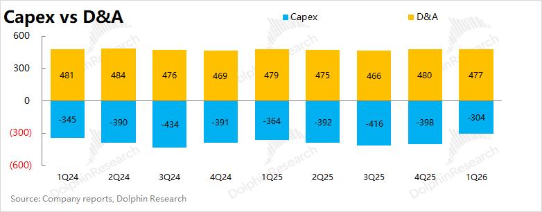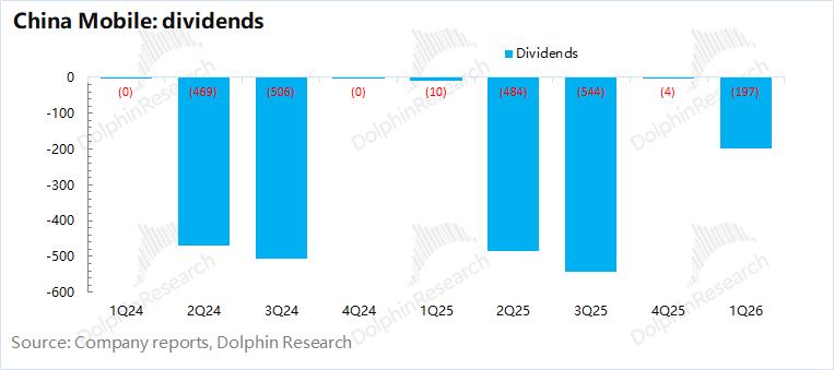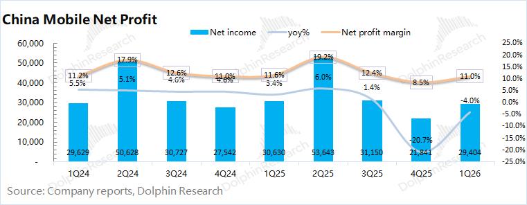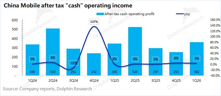 中国移动2026年第一季度净利润294亿元,同比下滑4%。由于公司的折旧摊销高于资本开支,从现金流的角度看,公司本季度的税后现金性经营利润为362亿元(不考虑非经营因素影响),同比也有17亿元的提升。